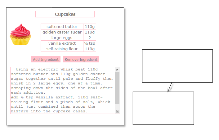 We also use setBounds to specify the location of the new DiagramNode on the diagram’s work area. It is also important to add the new node to the collection of DiagramItem -s with addItem if we open the web page in browser, we will see the recipe node for cupcakes. If we create new nodes, however, we will see that they render as default white rectangles: