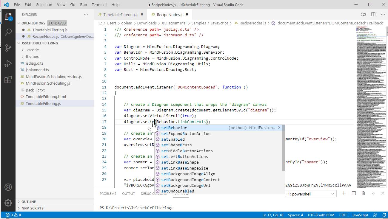 Now that we have set up all code in the web page, we start coding the JavaScript code-behind file. We add some namespace mappings, to make the code shorter. If you are using Visual Studio Code, you can add the TypeScript definitions of the Diagram library. This will enable IntelliSense support while you code.