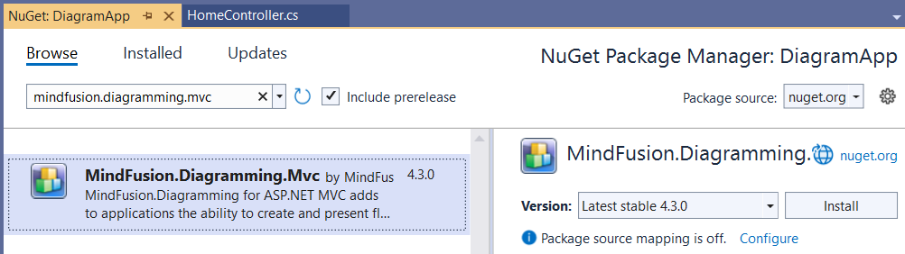 Open the Browse tab, and enter MindFusion.Diagramming.Mvc in the search field. Select the MindFusion.Diagramming.Mvc package and click Install.
