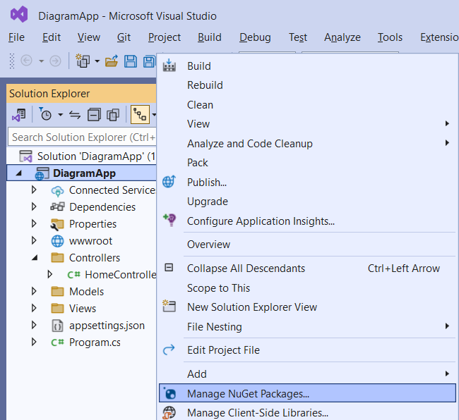 In order to integrate the Diagramming API into your ASP.NET Core Web App (either MVC or Razor Pages), select Manage Nuget Packages from Project menu: