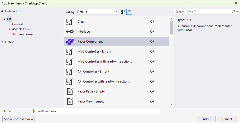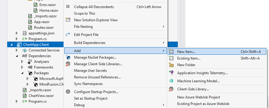 Once the package is installed, proceed with adding a new Razor component to the .Client project: