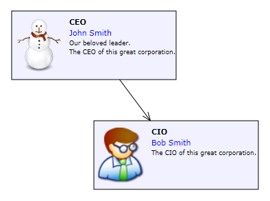 // create first OrgChartNode OrgChartNode node1 = new OrgChartNode(diag); node1.setStroke(new Pen(0.5f, Color.RED)); node1.setBounds(20, 10, 80, 40); node1.setTitle("CEO"); node1.setFullName("John Smith"); node1.setText("Our beloved leader.\n" + "The CEO of this great corporation."); node1.setImage(loadImage("image1.png")); diag.add(node1); // create second OrgChartNode OrgChartNode node2 = new OrgChartNode(diag); node2.setBounds(60, 60, 80, 40); node2.setTitle("CIO"); node2.setFullName("Bob Smith"); node2.setText("The CIO of this great corporation."); node2.setImage(loadImage("image2.png")); diag.add(node2); // create connector diag.getFactory().createDiagramLink(node1, node2); |