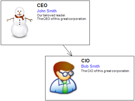OrgChartNode node2 = new OrgChartNode(diagram1); node2.Bounds = new RectangleF(60, 60, 80, 40); node2.Title = "CIO"; node2.FullName = "Bob Smith"; node2.Text = "The CIO of this great corporation."; node2.Image = Properties.Resources.Image2; diagram1.Nodes.Add(node2);