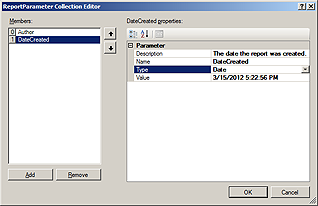 Report parameters can be referenced in expressions by name. To access a report parameter, prefix its name with "Properties." or "Report.". The following example demonstrates an expression that references the DateCreated parameter defined earlier: