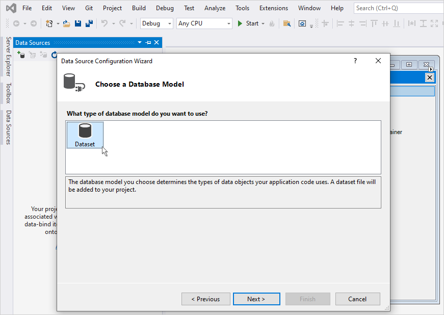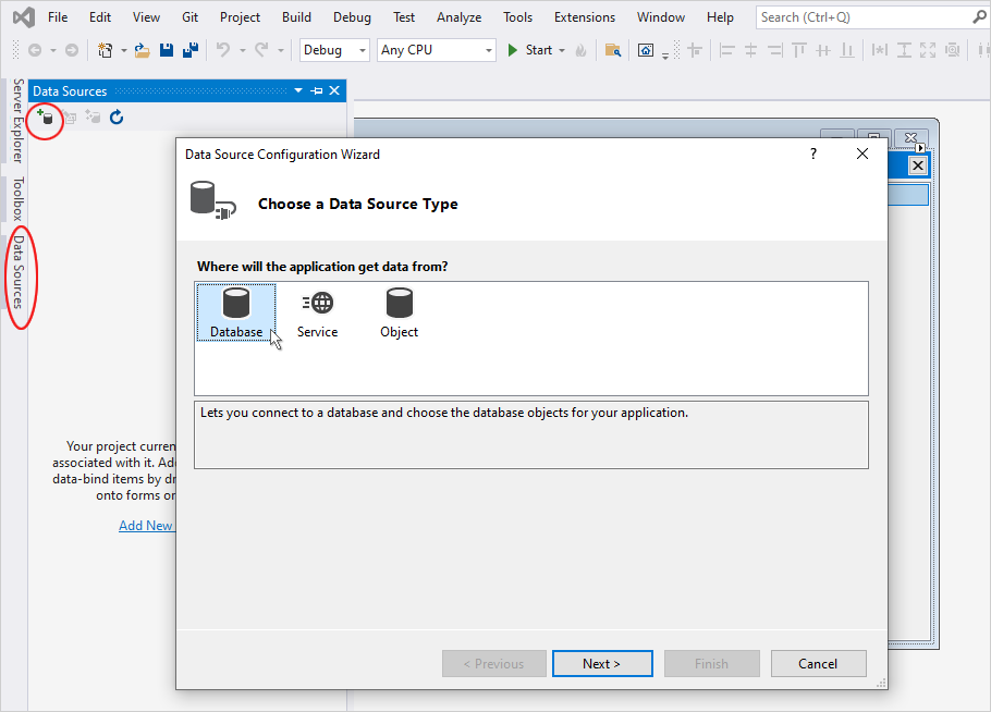 Select the "Data Sources" tab from the tabs at the left side of your Visual Studio, or press Shift+Alt+D to show it. Click on the "+" icon in the icon header of the panel that appears. The "Data Source Configuration Wizard" starts.