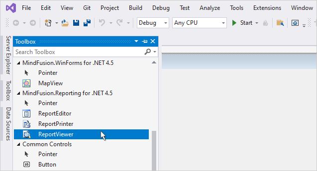 Open the main Form of your application. I you have installed the Reporting component, you will have several reporting items in a group called "MindFusion.Reporting for .NET". Drag and drop the ReportViewer component.