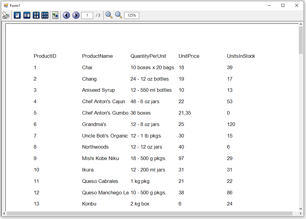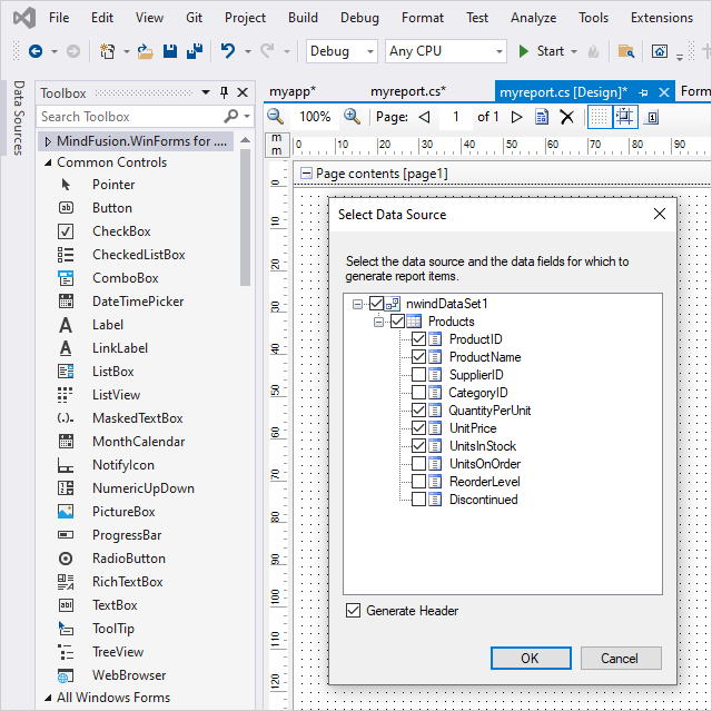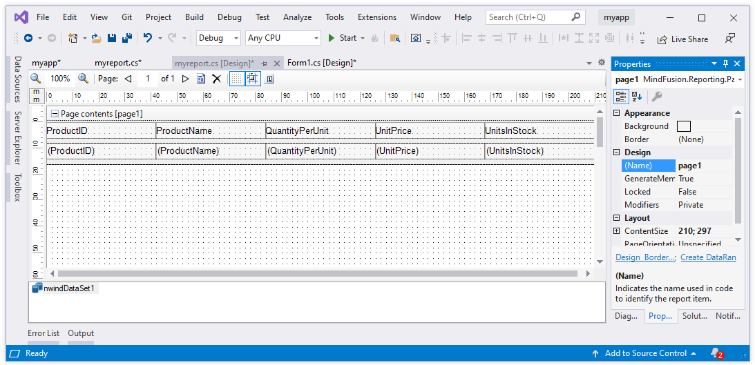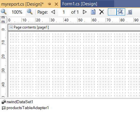 The DataRange is already bound to the Products table. However, the table adapter needs to be filled with information from the database. Unfortunately this cannot be performed in the designer. Instead, we have to manually modify the source code of the report.
