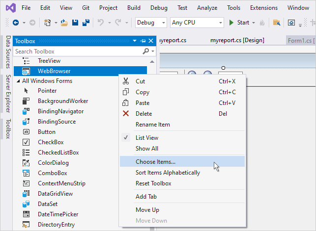 If you have not installed the Reporting library, you have to right-click on the Toolbox, choose "Choose Items" and in the dialog navigate to the location of the MindFusion.Reporting.WinForms.dll. Once you select it, VS will add the ReportPrinter and ReportViewer components to the toolbox. They should be initially selected, so simply confirm the import by clicking 'OK'.