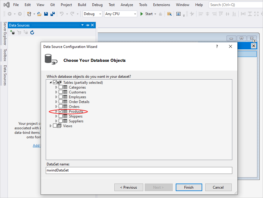 Expand the 'Tables' node and select the 'Products' table by placing a check in the box to its left. Type the name of the imported dataset in the text box at the bottom of the dialog (this tutorial uses the default - nwindDataSet), then click 'Finish'.