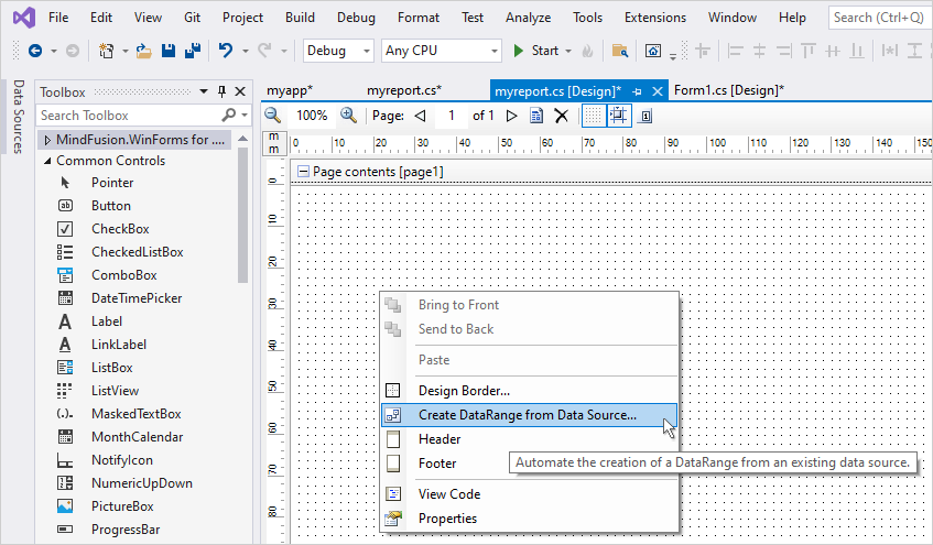 This tutorial will help you create a very simple data-bound report from scratch. The following steps are explained in more details below: