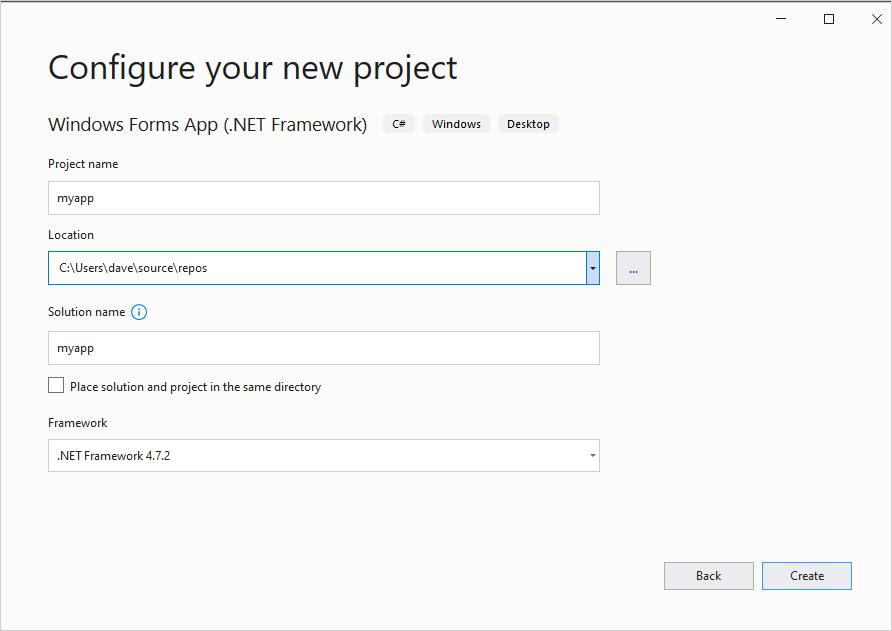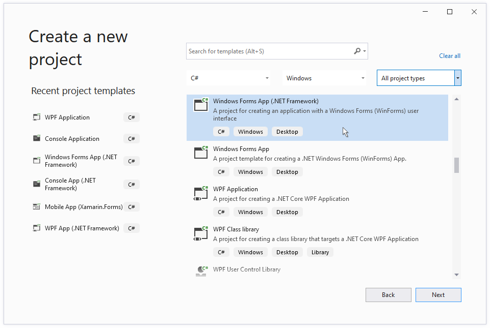 In the dialog box that appears, select the Windows Forms App (.NET Framework) template, and click Next.