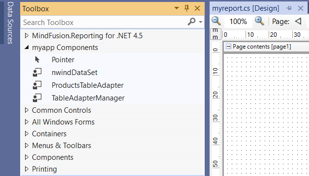 Rebuild the project and wait a few seconds for the toolbox to refresh. A new category should appear in the toolbox. It is named after your project (in this particular case - 'myapp Components'). There are two items in this category - nwindDataSet and ProductsTableAdapter representing the data set and the data adapter for the Products table respectively.