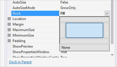 While the newly added ReportViewer component is selected on the form, open the 'Properties' window and modify the value of its Dock property from None to Fill, as illustrated below: