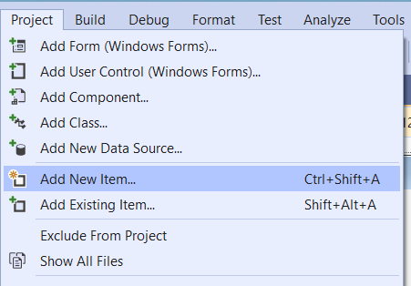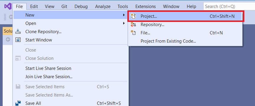 Open Visual Studio and select the File -> New -> Project menu command in order to create a new project.