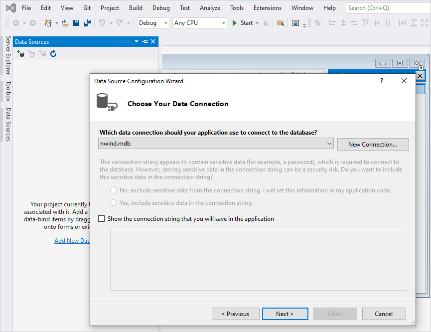 - Click 'OK' to close the 'Add Connection' dialog box, then click 'Next' to move to the next step of the wizard. Visual Studio will ask you whether you want to copy the mdb file to your project directory and modify the connection string to reflect this. Select 'Yes'.