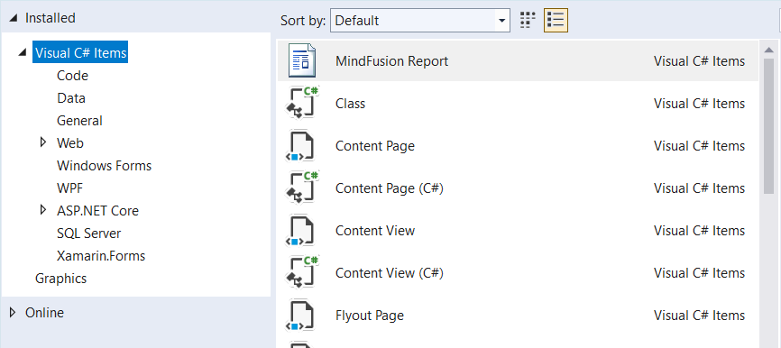 The 'Add New Item' dialog box is displayed with the list of all item templates registered with Visual Studio. Select the 'MindFusion Report' item in the list, then type the name of the report class file in the text box at the bottom of the dialog ('myreport' for the purposes of this tutorial) and click 'Add'.