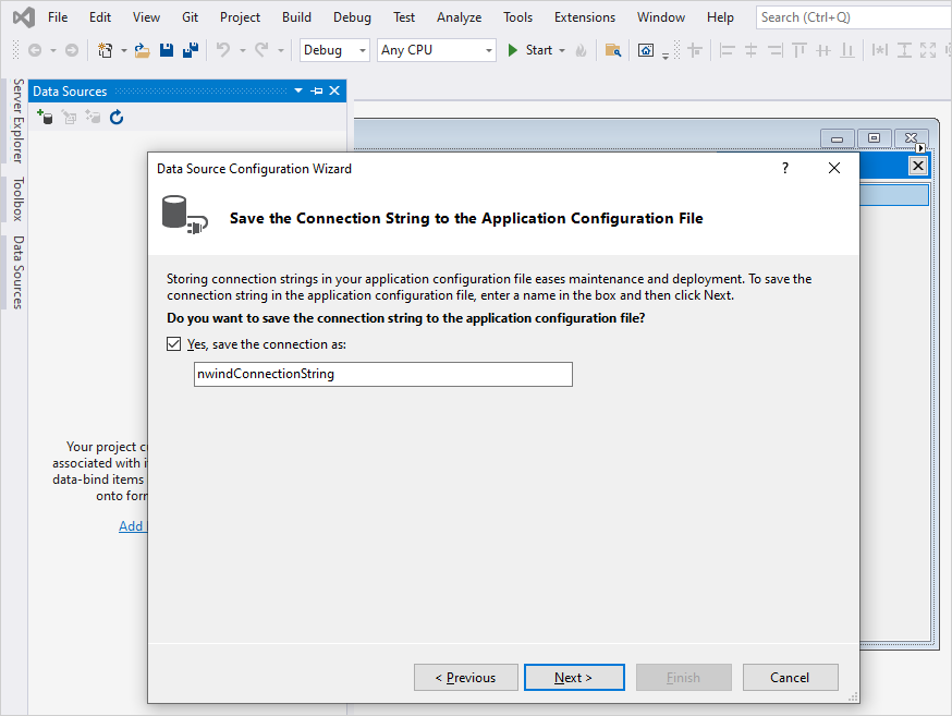On the following step save the connection under the default name 'nwindConnectionString', then click 'Next'.