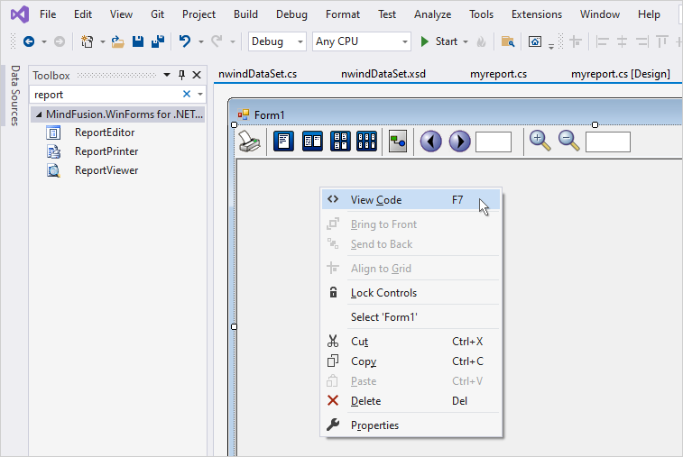Now that we have a report viewer and a ready report class, all we need to do is create an instance of the report and select this instance in the viewer. We have to do this manually in the code of the form class. Right-click on the form designer and select the 'View Code' command from the context menu.