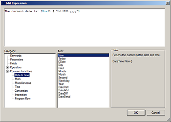 The expression will be evaluated when the report, containing the label is processed by a call to its Run method. Once the expression is evaluated, its string representation is inserted at its place in the text. In the above example, when the label is displayed, the result will be similar to the following: "The date and time now is: 12/15/2000 1:05:11 PM".