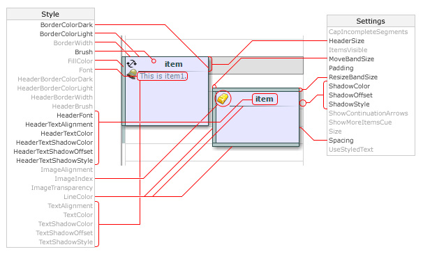If you want to completely draw the items in your code, you can use a custom viewer. The item viewers are associated with an item on a class level, so if you want to use your own viewer, you should create a new custom item class. Tutorial 5: Custom Item Viewers and Editors illustrates how to implement custom item viewer. Keep in mind that items using custom viewers are not rendered by the control and their appearance is dependent entirely on the viewer.
