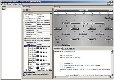 When the theme is being edited, a new form appears in the right part of the application. You can modify the properties of the theme from the property grid on the left side of this new form the same way you would modify the properties of the Calendar control in the Visual Studio design environment. You can observe the results of your modifications in the preview window available in the right side of the theme form. Below the preview window there is a text box, containing the source code of the current theme. You can copy the source code at any given time and paste it in your application. The other way to use the theme(s) is to compile the package in a separate dll file.