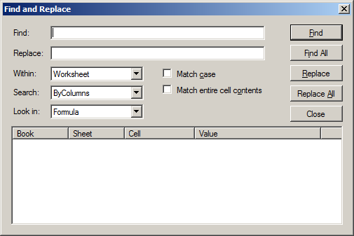 RemarksTo use the form, create an instance of the FindReplaceForm class, providing the workbook to search and the cell to start the search from, and call the ShowDialog method. The various options can be get or set through the respective form properties - Find, Replace, FindWithin, SearchOrder, LookIn, MatchCase, WholeCells. When the user clicks the Find or Replace buttons, if there is a found cell, the form raises the CellFound event. When the user performs a multiple search and clicks on any of the entries in the result list, the form raises the CellActivated event. The following image shows the form: