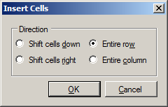 RemarksThis form can be used to prompt the user to insert cells in a worksheet. To use the form, create an instance of the InsertCellsForm class and call the ShowDialog method. The user's choice can be obtained from the Result property. The following image shows the form: