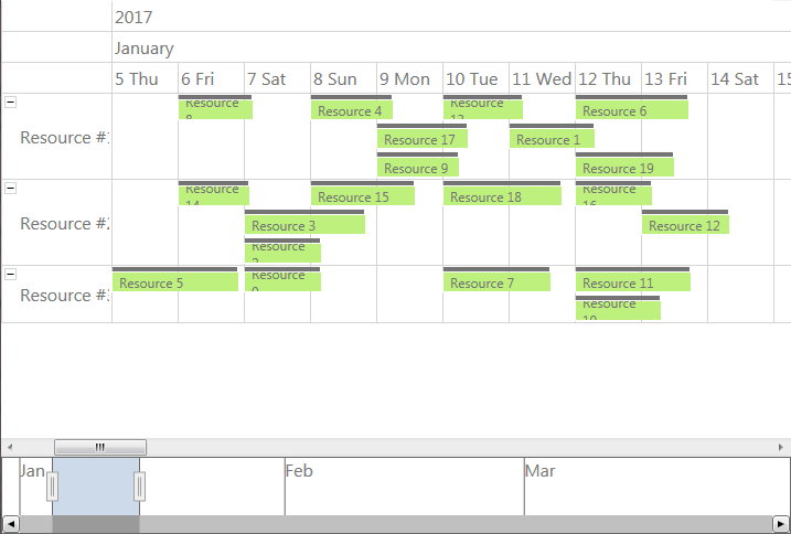 The Calendar control can integrate with the new RangeSelector component in order to implement a timeline in the Resource view. The new ResourceTimeline sample illustrates this integration.