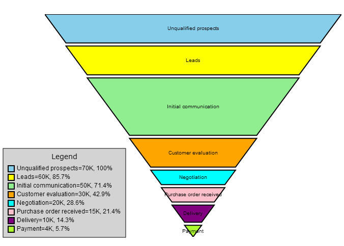 Funnel charts are often used to represent the stages of a process and show relative values or measurements associated with each stage. In MindFusion.Charting API, funnel charts can be created using the FunnelChart control associated with a FunnelSeries providing data. FunnelChart inherits appearance properties from the base Chart class, and offers additional customization through StemWidth and SegmentPadding properties.