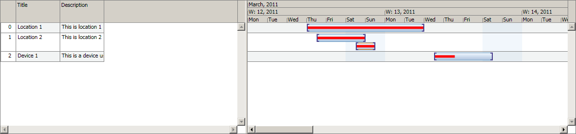 The ResourceChart displays the resources in a project and their allocation amongst different activities (tasks). The control is split in two major parts - data grid to the left and schedule subview to the right. Both of them display the same items only in different ways. The grid to the left display the resource properties. The view to the right displays the allocations of the resource. Each resource is displayed in its own row and may have more than one allocation. If a resource is allocated to different activities during the same period of time, the allocations are said to collide and they are displayed one on top of the other. The allocations in the ResourceChart can be modified interactively by dragging them around in the schedule view. The resources can be modified by adjusting their properties in the data grid to the left. For more information about item interactions check the User Interaction topic.