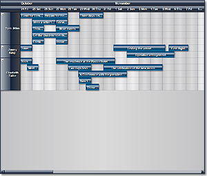 Set the CurrentView property of the Calendar class to ResourceView to select the resource view. This view displays the distribution of items over a period of time for particular contacts, locations, tasks or resources. The view displays a single row for each individual contact, location, task or resource and up to three timelines. In order to view associated items in this view, the GroupType property of the Calendar must be set to GroupByContacts, GroupByLocations, GroupByTasks or GroupByResources.