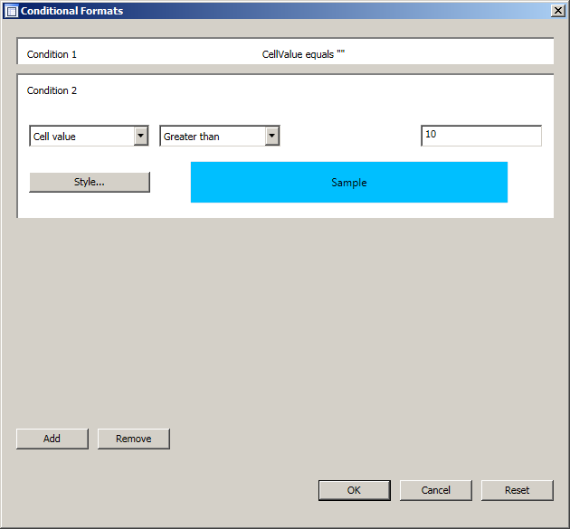RemarksThis form can be used to add, edit, and remove conditional formats for a cell or a range of cells. To use the form, create an instance of the ConditionalFormatForm class, by providing the related workbook and the IStyle object of the target cell or range of cells, and call the ShowDialog method. To apply the changes made through the form, call the Apply method. The following image shows the form:
