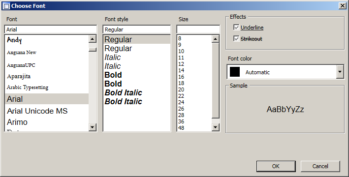RemarksThis form can be used to select fonts within a worksheet. To use the form, create an instance of the FontPickerForm class, by optionally providing the IStyle that should be used to initialize the form, and call the ShowDialog method. To get the user's choice, use the FontName, FontSize, Bold, Italic, Underline, Strikeout and TextBrush properties. The following image shows the form: