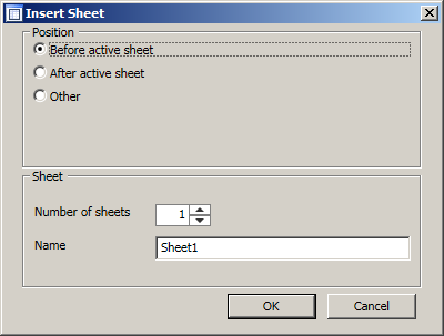 RemarksThis form can be used to prompt the user to insert new sheets in a workbook. To use the form, create an instance of the InsertWorksheetForm class by providing the related workbook and call the ShowDialog method. The user's choice can be obtained from the Position, Index, NumberOfSheets, and SheetName properties. The following image shows the form: