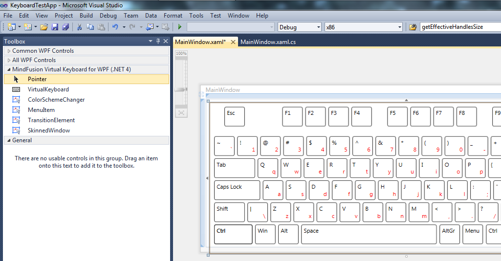 2. With default settings, Visual Studio should open the project's main window in Xaml Designer. If using Visual Studio 2010 and newer version, you should now see MindFusion Virtual Keyboard toolbox palette installed in the toolbox with the VirtualKeyboard control inside it.