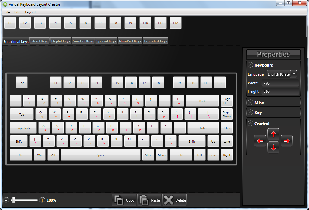 The component includes two predefined keyboard layouts represented by Default and Extended members of the KeyboardMode enumeration, that can be assigned to the Mode property of VirtualKeyboard. The Default layout is similar to a laptop keyboard without a numpad. Extended mode corresponds to a full keyboard with numpad and navigational key sections.