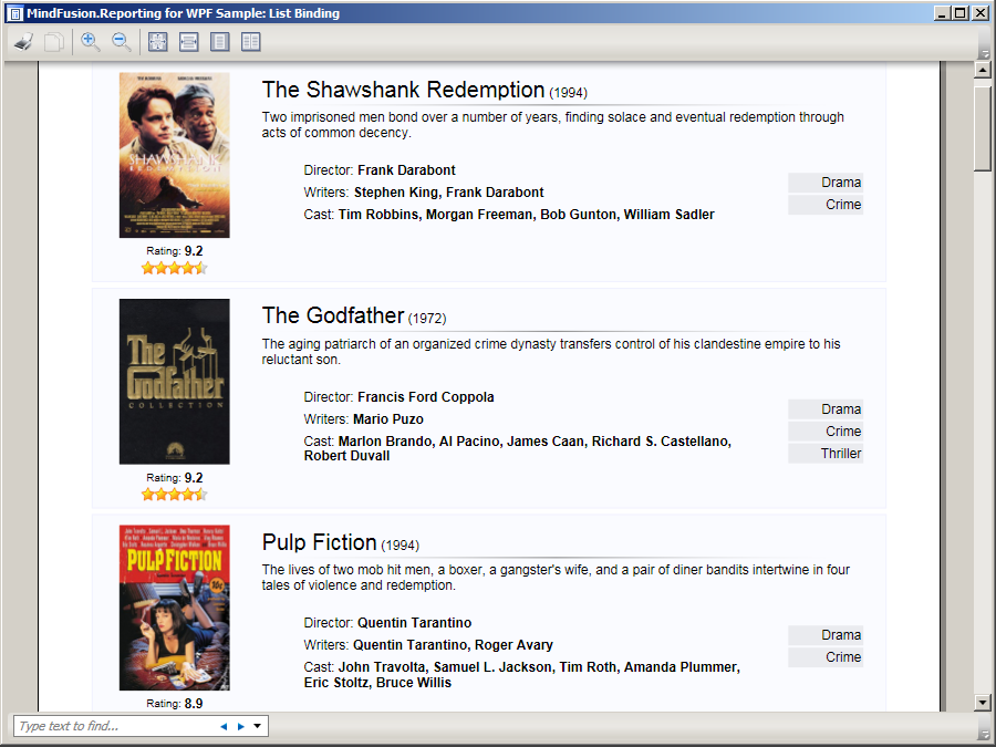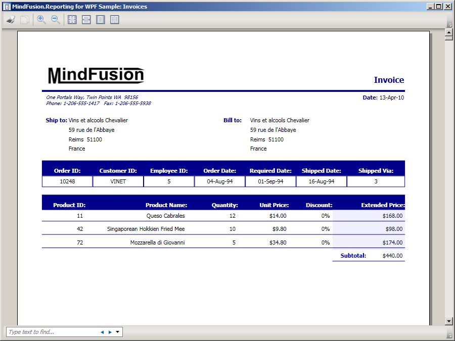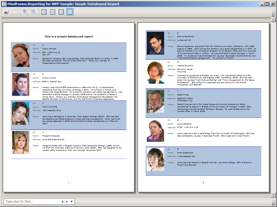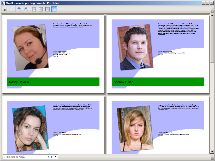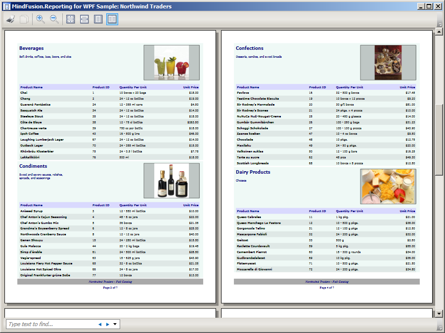 Screenshots of reports created with the MindFusion.Reporting for WPF component.