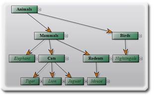 If a diagram represents a tree structure, the tree branch starting from a node can be collapsed or expanded again in order to hide or display hierarchy details. To enable this, call the setExpandable method. There is a [±] button displayed beside an expandable node to allow users to collapse or expand the tree branch starting there. By default, pressing that button automatically toggles the Expanded property of the node and raises the TreeExpanded or TreeCollapsed events.