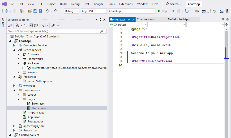 Then you can proceed and install the Charting library from NuGet as explained earlier. Note: You need to add the Blazor Charting package only to the .Client project:
