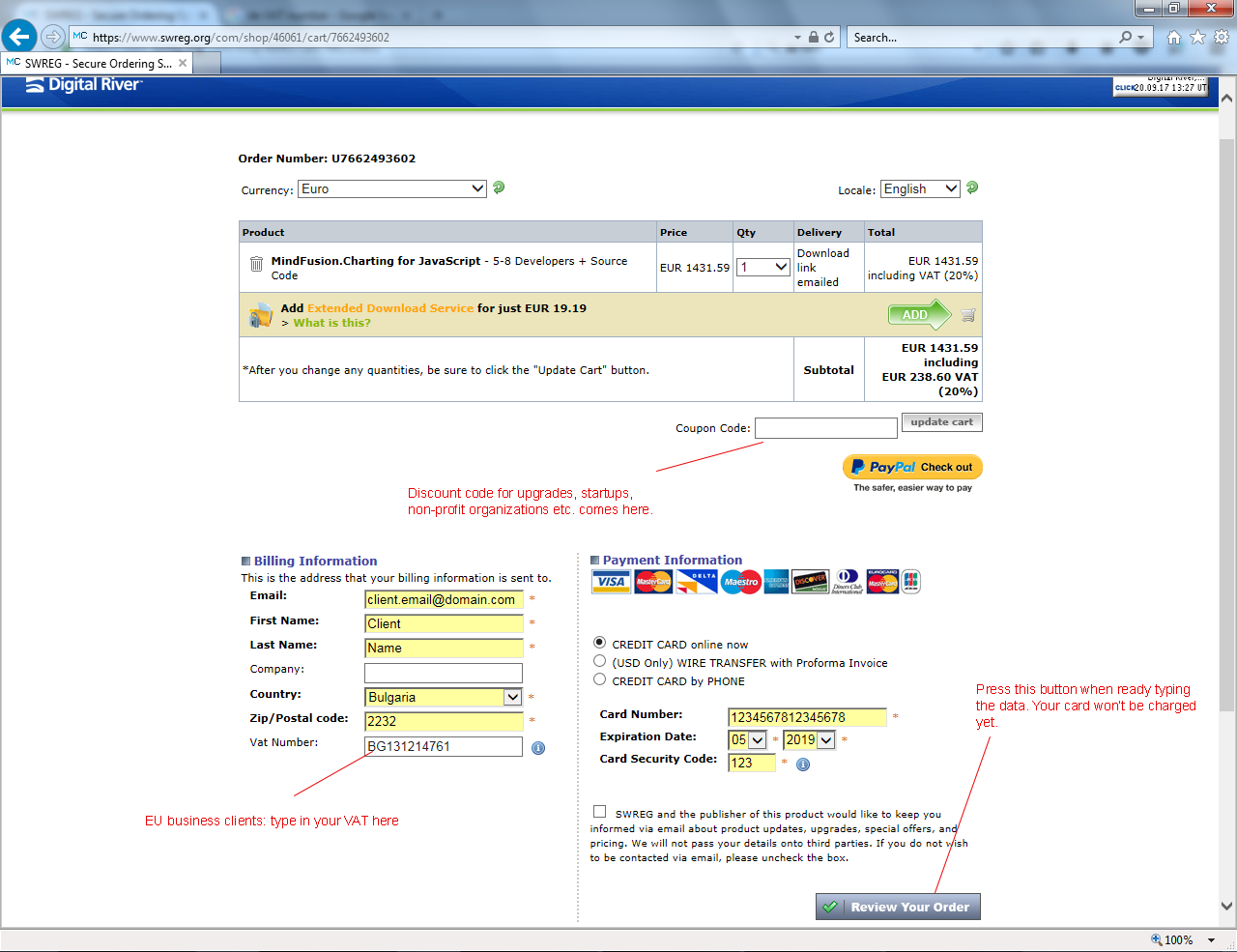 If you want to buy online with a debit / credit card when you click the buy button in the price table you would be taken to the store of our resellers SWREG. MindFusion currently does not process directly card payments.