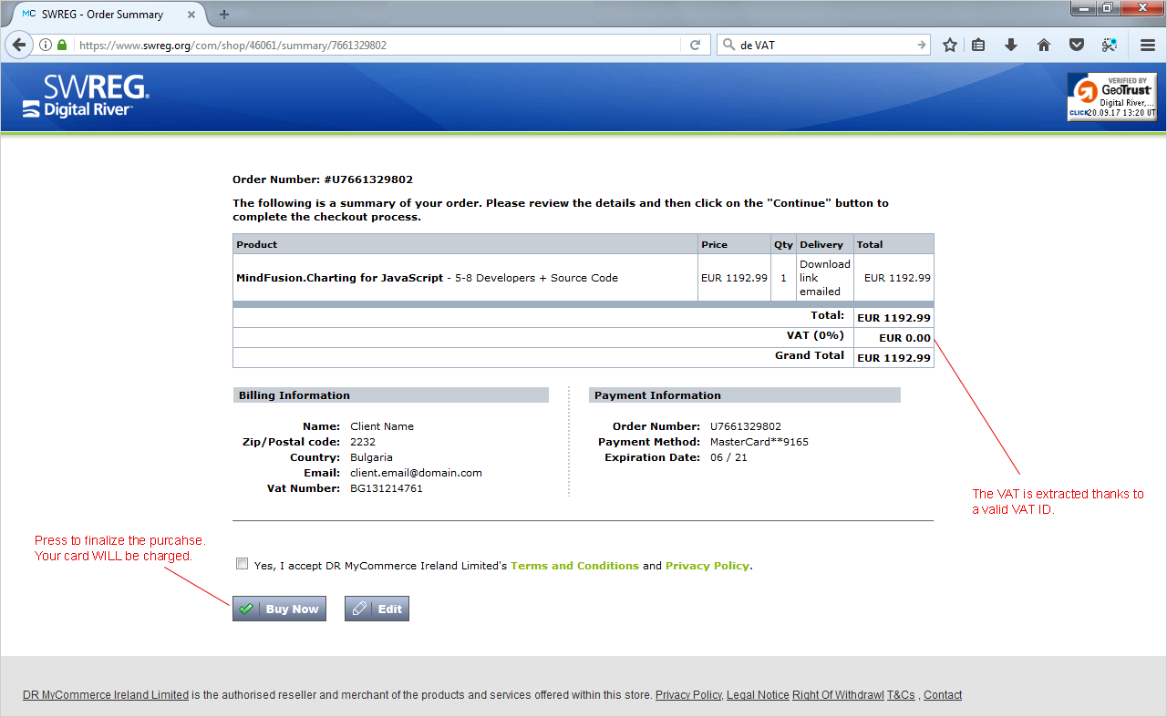 This is the last step before the final purchase. You can revise and edit the data. If the VAT Id is correct, the VAT amount has been cleared.