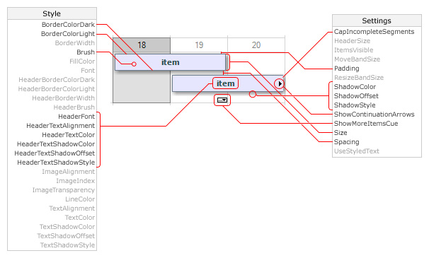 You can customize the general appearance of items in a schedule, by setting various properties in Calendar.ItemSettings. This would affect the appearance of all items in the current schedule. To customize the appearance of individual item, adjust its Style, SelectedStyle, PointedStyle, and PointedSelectedStyle properties. The particular style that will be used when the item is rendered depends on the state of the item. Style is used when the item is neither selected nor the mouse hovers over it. SelectedStyle is used when the item is selected and the mouse is not over it. PointedStyle is used when the mouse is over a non-selected item and, finally, PointedSelectedStyle is used when the item is selected and the mouse is over it at the same time. PointedStyle and PointedSelectedStyle are only used if ItemSettings.UseExtendedStyles is set to Enabled. Extended styles are disabled by default. The item styles support the cascading paradigm described in Styles and Themes. The most general item styles are defined in the current theme. They cannot be changed by any means except by changing the theme itself. The styles defined in Calendar.ItemSettings are of higher priority and any of their properties that are explicitly specified will be used prior those from the theme. The styles defined in individual items are of highest priority and will always be used first, when present.