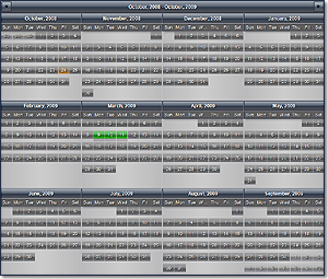 The Month Range view displays an arbitrary long sequence of months arranged in rows and columns. Each month represents a grid of day cells, each of which displays the day number and the schedule events set to occur on its respective date. The months in the view can be scrolled back or forth in time by an arbitrary interval using the navigation buttons in the view header.