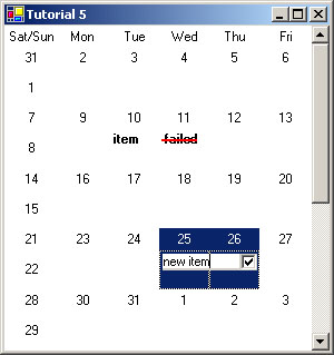 Make sure the default item in the calendar is MyApp by specifying typeof(MyApp) (or GetType(MyApp) in Visual Basic) for the calendar's InteractiveItemType property. Set the CurrentView to WeekRange. Then build and run the application. Here is a screenshot of what the application output should look like after creating several items.