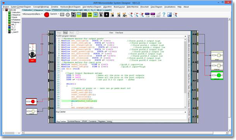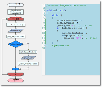 Un diagrama de flujo que puede ser dibujado para C o Basic y un código completo automáticamente generado usando la información de diagrama de bloque para el detalle de hardware. El excelente programa de ejemplo de arrastrar y soltar de Mindfusion hizo esto posible.
