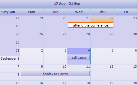 No hay límite para el número de elementos que se pueden crear - el control ofrece desplazamiento ilimitada si necesita mostrar muchos artículos. Puede importar y exportar información de eventos de/a Microsoft Outlook, el componente también es compatible con el formato iCalendar. Los horarios pueden ser impresos o persistidos en documentos XML.
