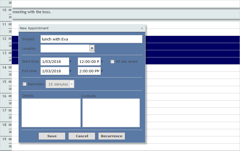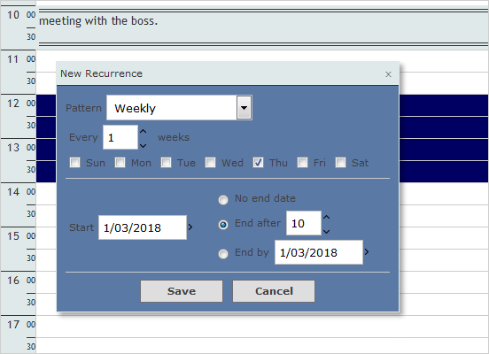 API Reference: SingleMonth View SettingsThe perfect way to organize the day for people whose work day consists of multiple appointments. The Timetable view lets you choose the time intervals and the number of days to be rendered. You can record several events at the same time.