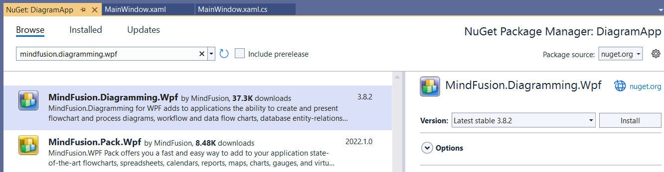 Open the Browse tab, and enter MindFusion.Diagramming.Wpf in the search field. Select the MindFusion.Diagramming.Wpf package and click Install. If you plan to use other MindFusion components along with the diagram (such as calendar, spreadsheet, report), select MindFusion.Pack.Wpf instead: