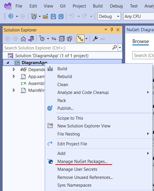 In order to integrate Diagramming for WPF into your Visual Studio project, select Manage Nuget Packages from Project menu: